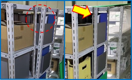 | 書庫にある品質保証部が使用している棚が固定 がされていないため、揺れた時に倒れて怪我をしてしまう恐れがある。棚と棚をボルトで固定をして転倒防止対策をした。 | |