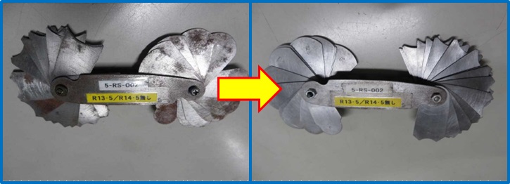 | 品質保証部で使用しているRゲージの表面・裏面が錆びついて付着してしまい使いにくい。数字も見えにくい状態である。油を使用しながらRゲージを磨き、付着したサビを撤去し清掃した。清掃後、動作もスムーズになり、数字も見える様になった。 | |