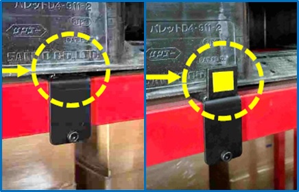 | ストッパーとパレットが同色な場合、距離感が分かりにくく、万が一、パレットがストッパーに重なった状態に気付かずに作業を行うと、パレットが引っ掛かり製品が落下しケガをする恐れがある。ストッパーに黄色の表示を貼付し、距離感が分かりやすく作業し易くなった事で作業時に引っ掛ける事が無くなり、製品が落下しケガをする恐れも無くなった。 | |