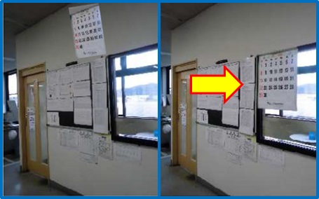 | カレンダーを付けている場所が床から3.5m上にあるので月が替わってめくる時に椅子に上ってめくるが、この時に椅子が動いて乗っている人が落下すると打撲や骨折等のケガをする可能性があるため、床から1m90cmの位置にカレンダーを付ける位置に変更した。椅子に上がらず、カレンダーをめくる事ができた。 | |