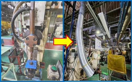 スポット溶接機でナット溶接を行っているが周辺エリアが霞むほど煙が発生していた。このままでは作業者及び周辺の方が肺の病気を発症するリスクがある。排気ダクトの設置を行い煙を外に排出した。改善後、エリア内の煙も低減でき、霞まなくなった。