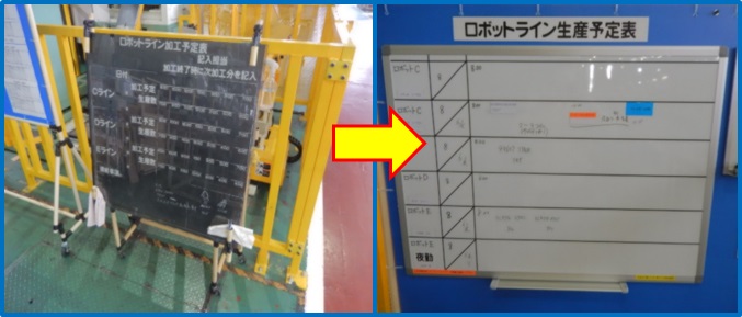 | 以前、ロボットラインで使用していた生産計画表が長年使用していたため、表示内容がかすれて確認しにくい状態である。また、専用のマーカーでしか記入ができず毎月購入費がかかり書いては消すといった動作のムダも目立つ。作業者に情報を早く正確に伝えるため、掲示板の改善を行なった。計画表はアクリルボードからホワイトボードに変更。マグネットシートに部品番号を記載したカードを用意し貼るだけで済む様にした。書く消す手間も解消し書き間違いが起こらず作業者に正確に情報を伝えることができた。ボードの配置場所を変更し裏・表面を活用。掲載部分を2倍にしカテゴリー別に情報を整理する事で見やすくする事ができた。マーカー購入費や書く消す動作のムダ解消で費用が大幅に削減できた。 | |