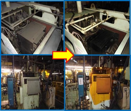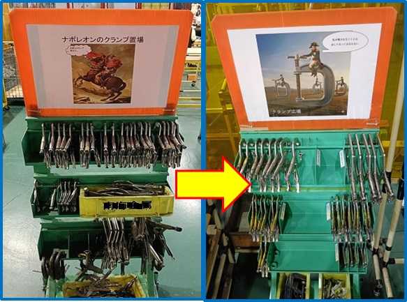 | ナポレオンのクランプ置場は構造上、クランプを出す際に引っ掛かり易くスムーズに出せない。区分けが無く乱雑に置かれている。作業者と上司に相談して、使用する予定のないクランプを破棄した。クランプ置場をスムーズに出し入れできる構造に変更し、表示を付けて種類ごとに区分け改善を行なった。 | |