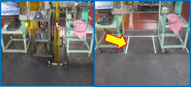 | 新規設備メッキ除去装置を設置したが、多少移動できるようになっており移動した際に元の位置に戻らず乱雑になってしまったため、白線を引いた。正しい位置にきちんと置かれているか一目瞭然になり改善ができた。今後、1台追加になる予定なので後1台設置した時に種類による整頓の方をして行く。 | |