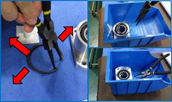 | ベアリングを押さえるためのCリングを挿入する際、Cリングプライヤーのリーチが非常に狭く、誤ってCリングが滑って飛び出す。圧でかなり遠くまで飛ぶため、付近の作業者に激突し、裂傷や失明の可能性の恐れがある。プラスチックケース内にて挿入作業を行う対策をした。万が一、Cリングが滑って飛び出してもケース内で反射するため速度が落ち、遠くまで飛ぶことは無くなった。 | |