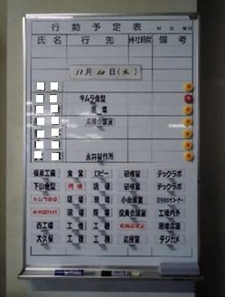 | 行先表示板の行先表示マグネットが乱雑になることがあり、行動予定表での管理が煩雑化していた。改善内容として行先表示マグネット専用の定置シートを作製・設置した。定置シートを行動予定表の中で使用可能な仕様に変更し、見やすさを向上。使用後の戻す位置が明確になり整理整頓が容易になった。行先表示マグネットの整理改善ができた。 | |